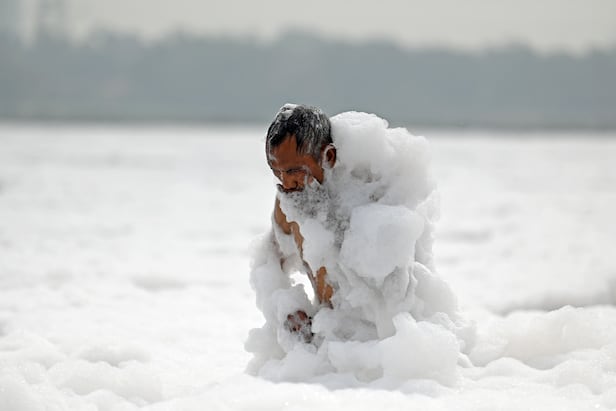 지난 6월 4일 인도 뉴델리의 야무나강에서 한 남성이 오염으로 생긴 거품속에 들어가 목욕을 하고 있다. 야무나강을 뒤덮고 있는 거품은 상류에서 버린 생활 오수와 산업폐기물이 만들어낸 유독성 거품이다. 하지만 힌두교 신자들에게 이 강은 신성한 강이다. 아무리 더러워도 이들이 거리낌없이 몸을 담그는 이유다.